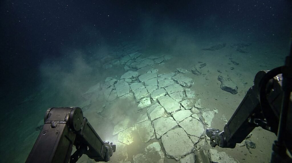 Uma formação rochosa no Pacífico com fraturas regulares que lembram uma estrada de tijolos amarelos, filmada pelo ROV do navio de pesquisa Nautilus.