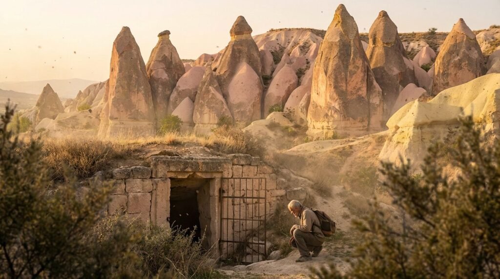 Na paisagem da Anatólia central, o cenário do Vale do Amor contrasta com o mundo oculto abaixo. Hoje, visitantes percorrem passagens escurecidas por fuligem de tochas seculares e encaram a claustrofobia para entender como comunidades inteiras sobreviveram nesse labirinto planejado para resistir e durar.