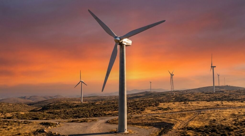 Turbina eólica moderna de três pás operando em parque eólico no Nordeste do Brasil ao entardecer